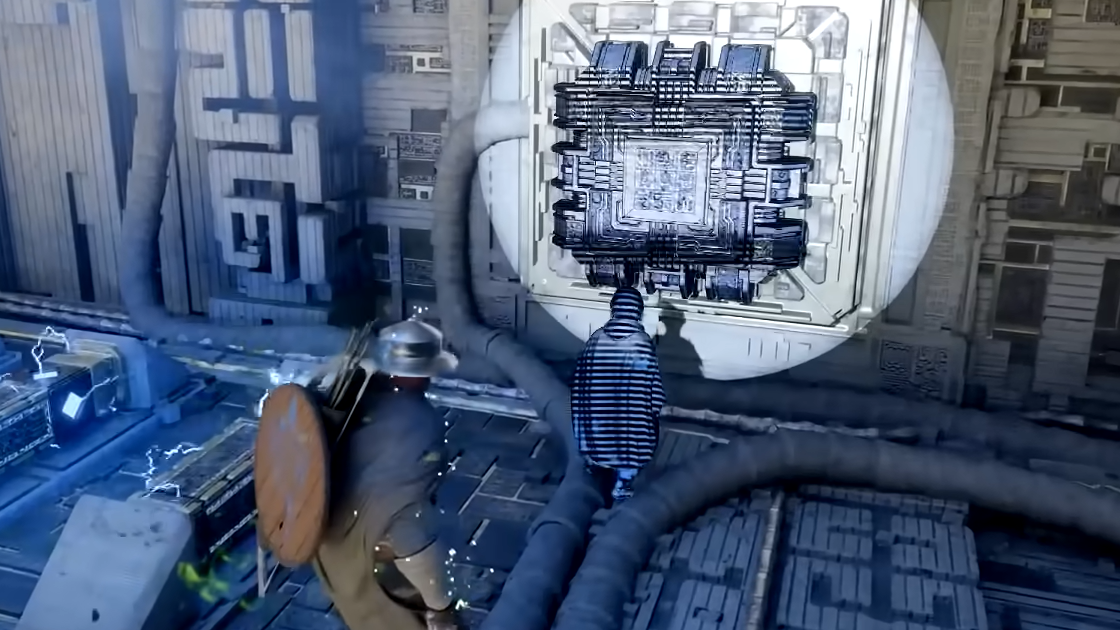 Step 3: Walk up to the tile you just placed and use Force Palm to punch it into the wall. This combines the Abyss Cell and powers up the device above.