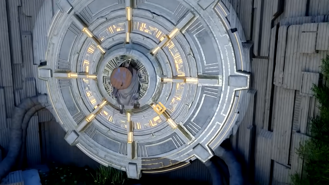 After your conversation with Alustin, you'll appear back outside the Axiom Archive. Walk through the triangular arch directly in front of you. An alignment device will appear — a small pillar with a round dial on top.