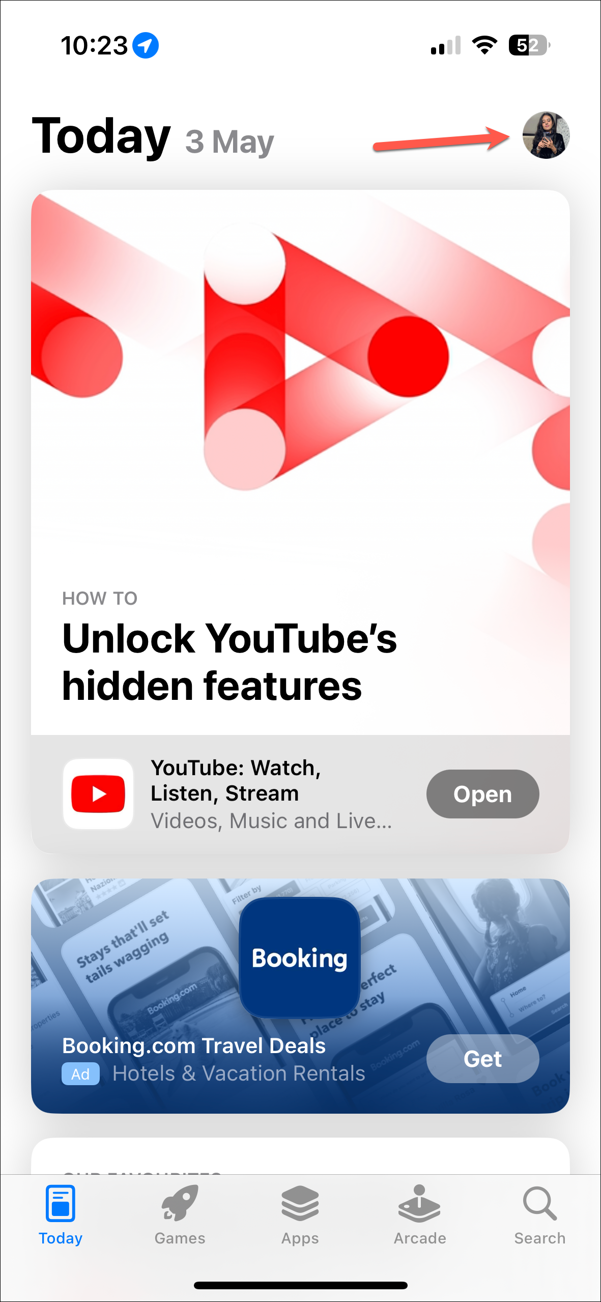 - Head to the App Store on your iPhone. Next, tap on your account icon in the top right corner to proceed.