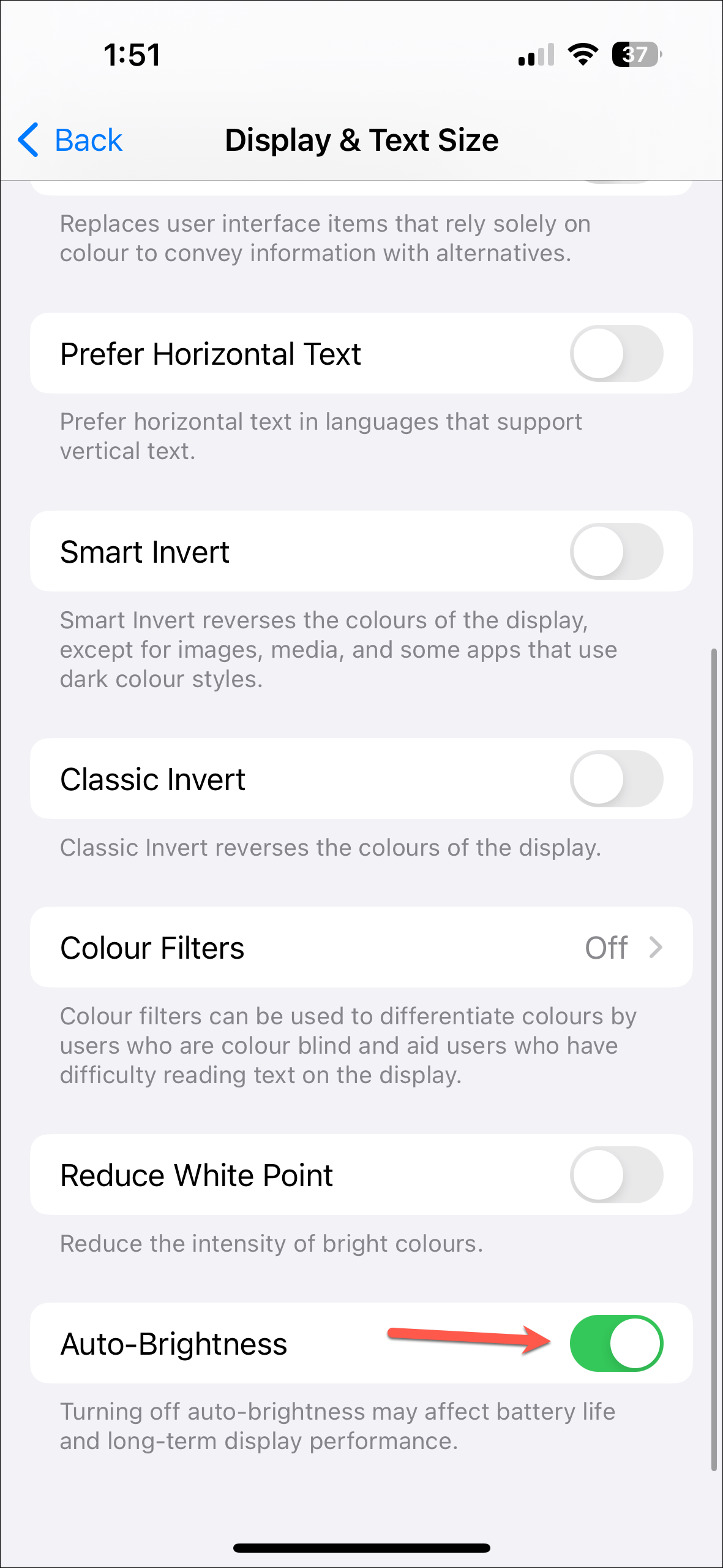 - Scroll down to the bottom of the page and turn on the toggle for 'Auto Brightness'.