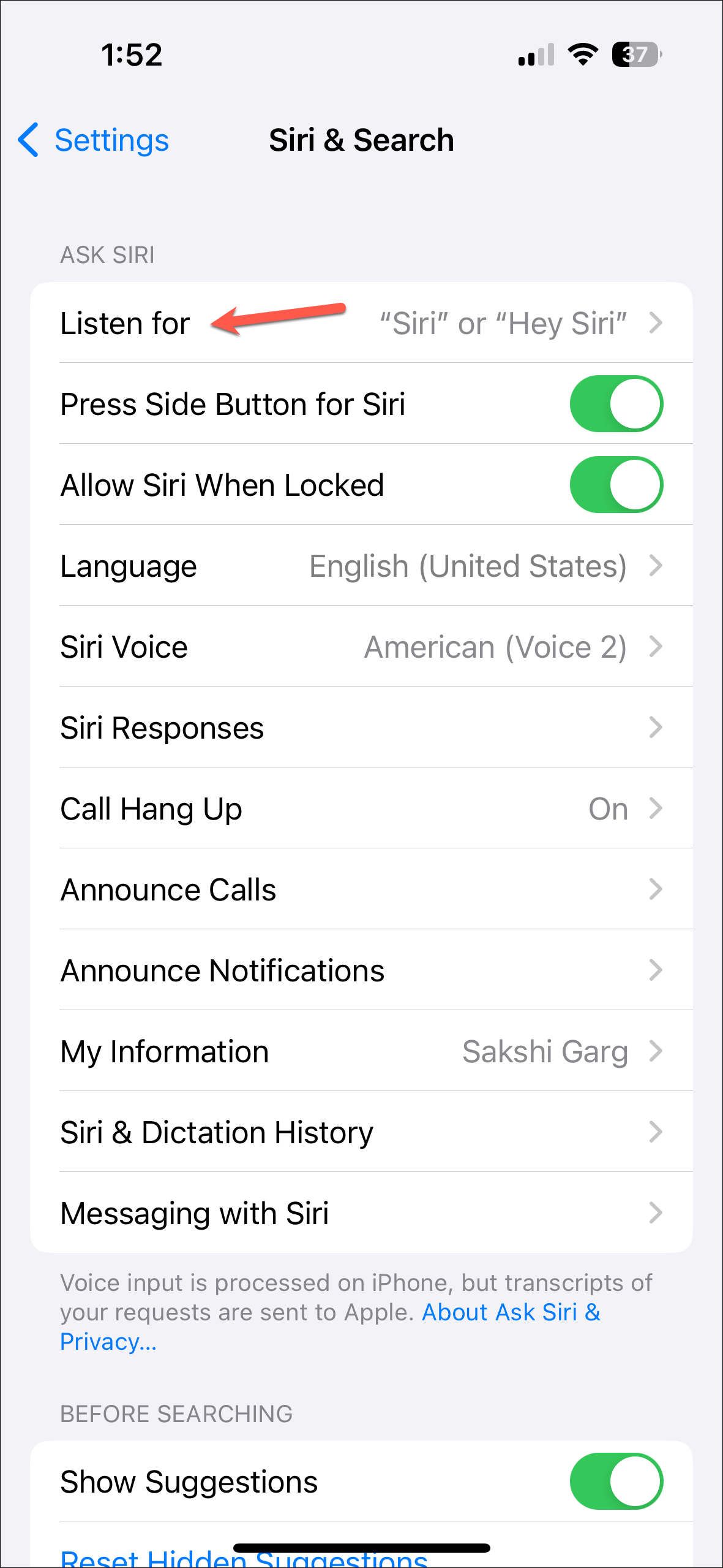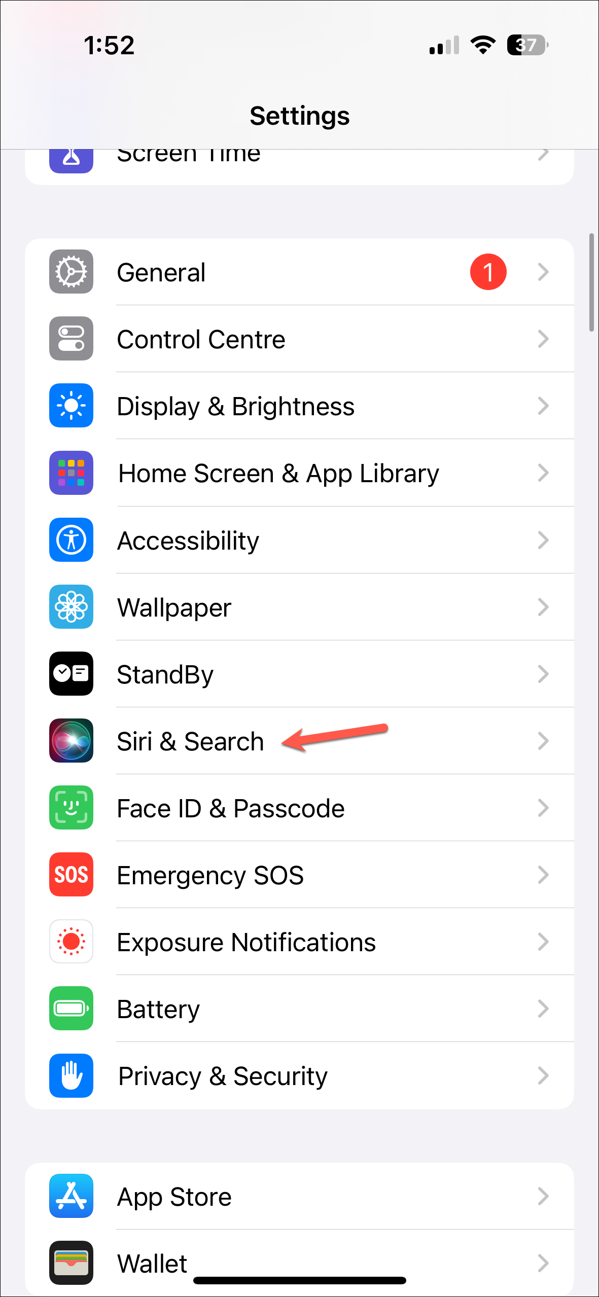- Launch the Settings app and choose the 'Siri & Search' option.
