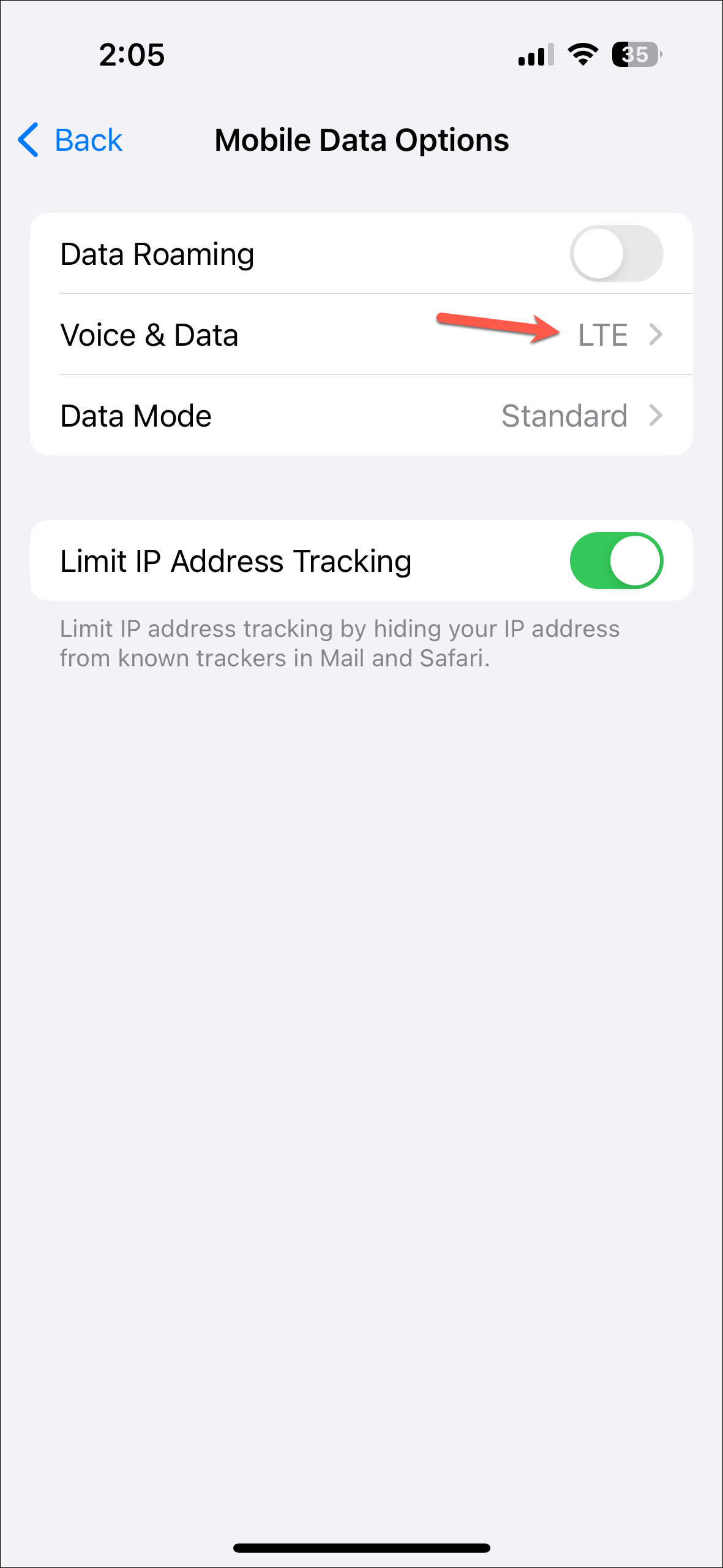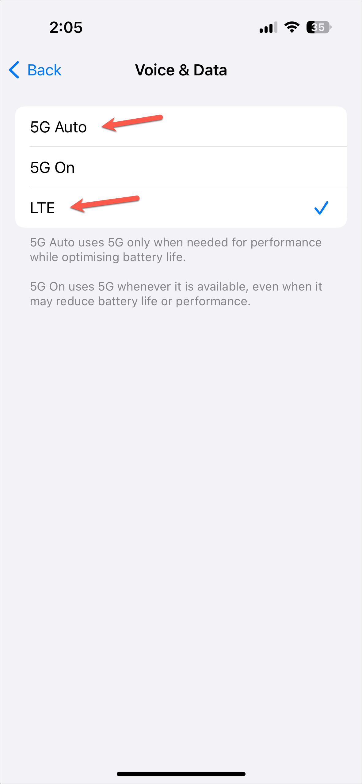 - Select 'LTE' or '5G Auto' to preserve battery life.