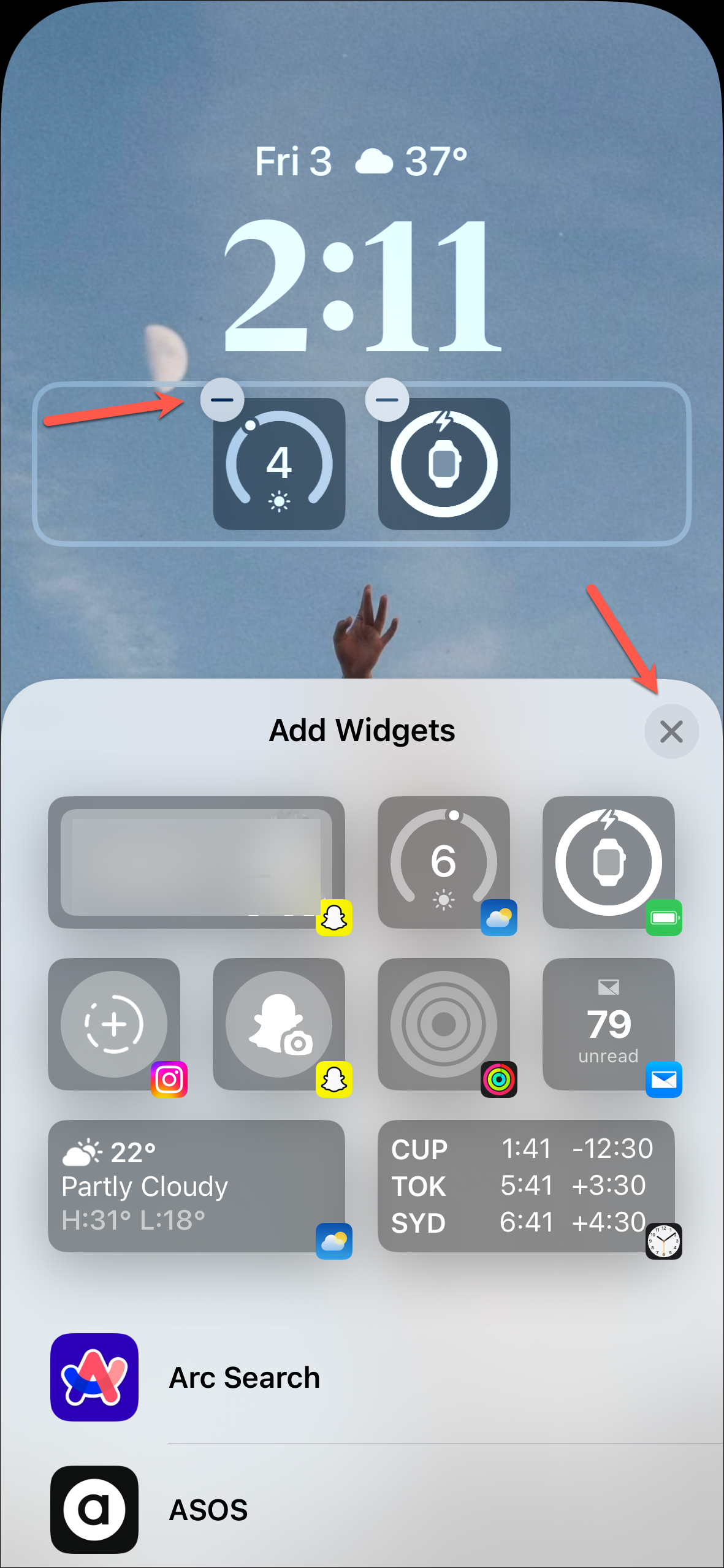 - Then, tap on the '-' icon on each widget to remove them. Tap 'X' to close the overlay window.