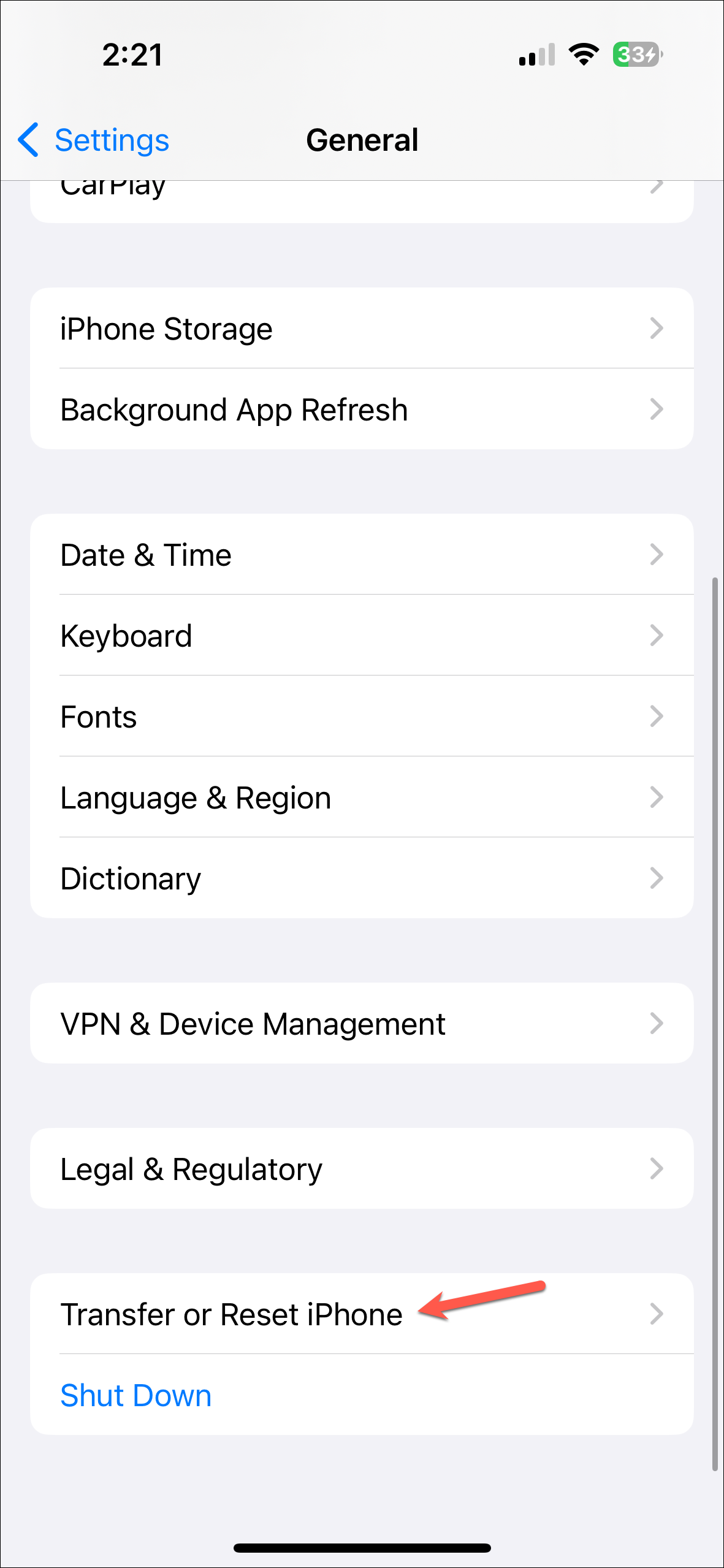 Settings>General. - Scroll down to the bottom and tap 'Reset or Transfer' iPhone.