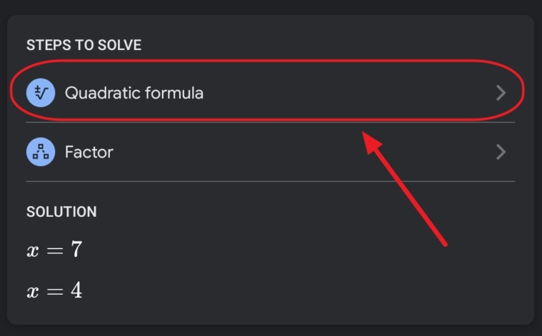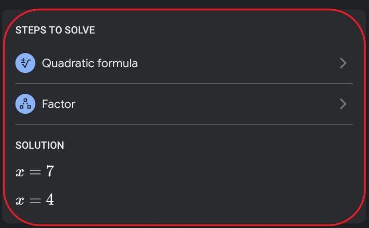 Google Lens will provide you with the steps to solve the problem, using all the methods applicable to the question. It will also display the final value of the solution, should you only need the final answer.