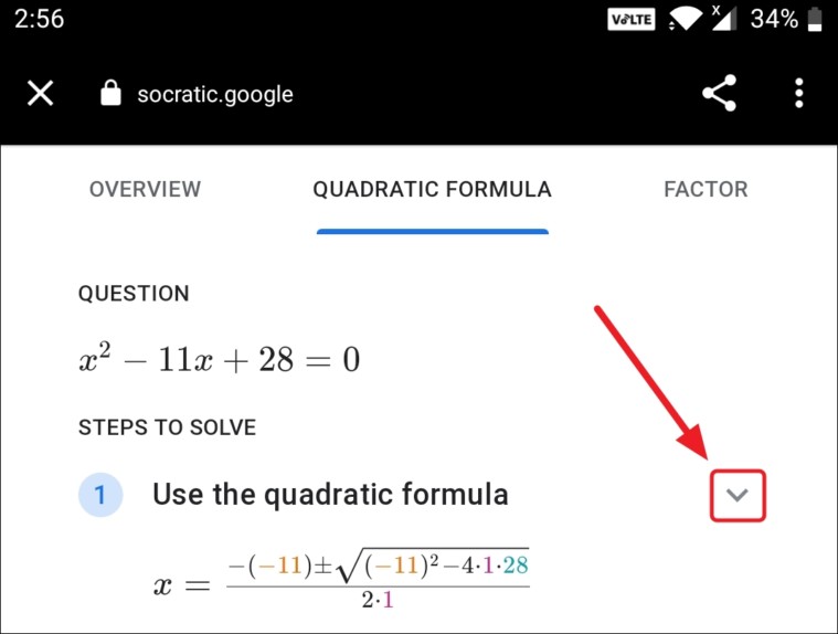 Google Lens will provide a view of all the major steps to solve the problem. To get a comprehensive view of a particular step, tap on the ‘inverted carat’ icon (downward arrow).