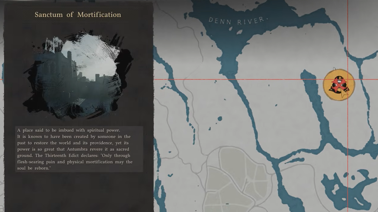 The Sanctum of Mortification sits on a patch of land along the Denn River in northern Demeniss. Unlike every other Sanctum in Crimson Desert, it is not assigned by one of the four Witches you meet in the open world. It can only be completed during the main quest "Fragments of Darkness" in Chapter 9, after you purify the golden statues. That story requirement means the Lightbringer trophy and achievement for cleansing all 16 Sanctums is gated behind reaching this point in the campaign.