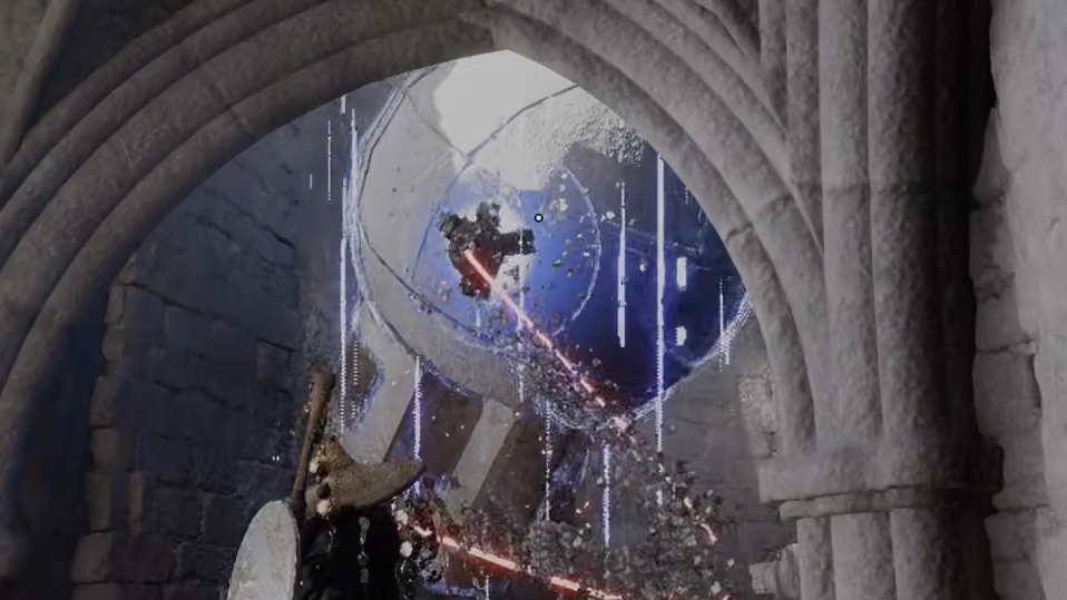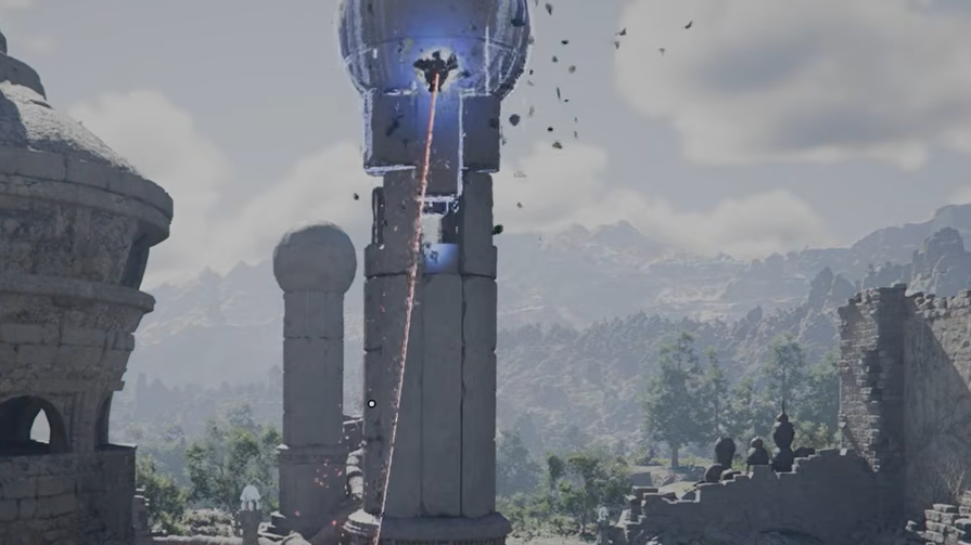 Step 2: Grab the dome using Axiom Force (hold L3 on PlayStation, Left Stick on Xbox, or TAB on keyboard). Carry it upstairs and out of the building toward the broken pylon in the courtyard area.
