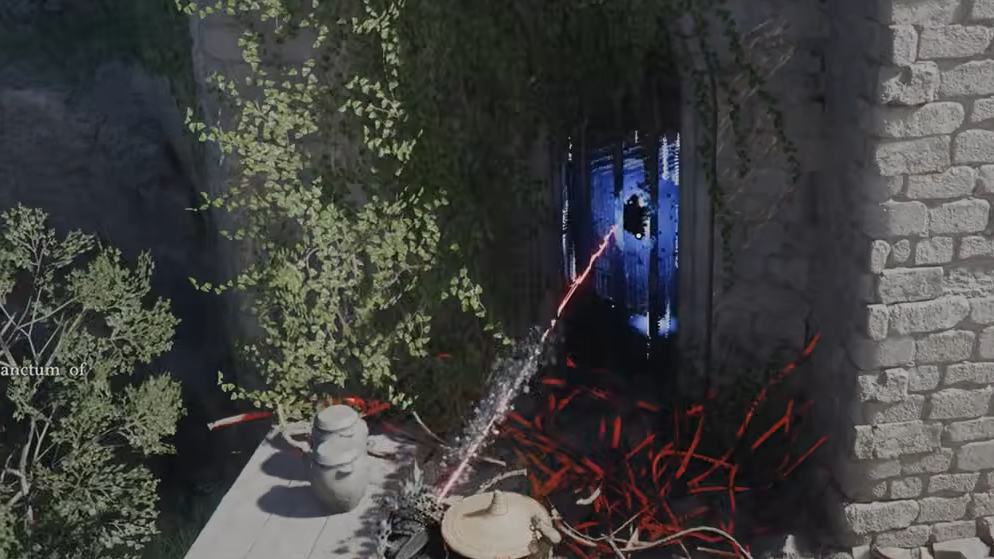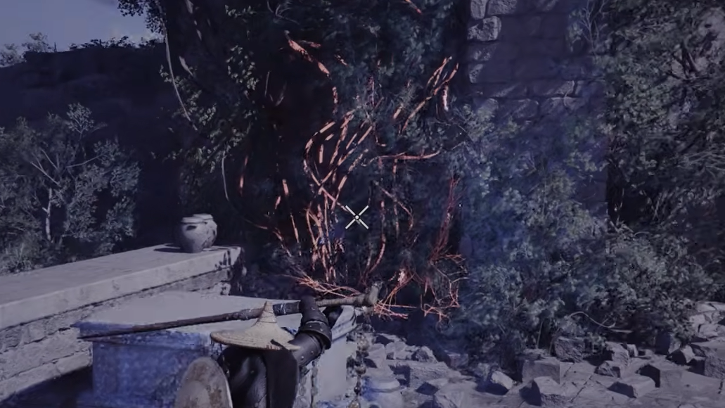Step 1: Exit the building where you originally found the dome and look at the exterior wall just outside. A thick patch of vines covers a section of the wall. Use Concentrating Light to burn them away. The input sequence is L1+R1, then hold L1 on PlayStation, LB+RB, then hold LB on Xbox, or CTRL + Left Click, then hold CTRL on PC. Fire arrows also work if you prefer.
