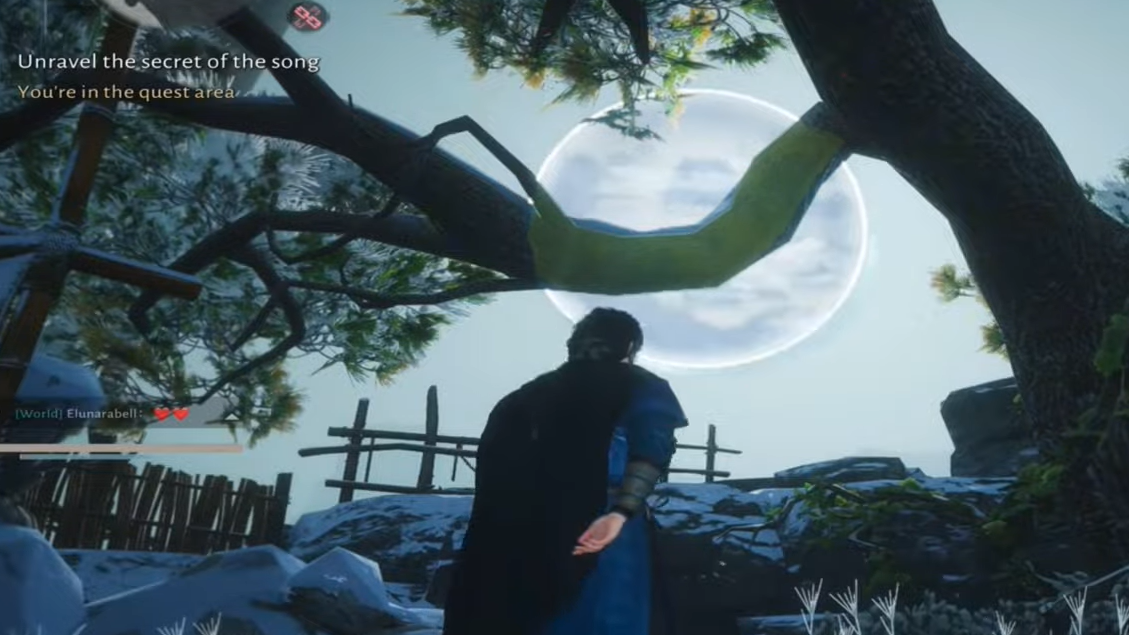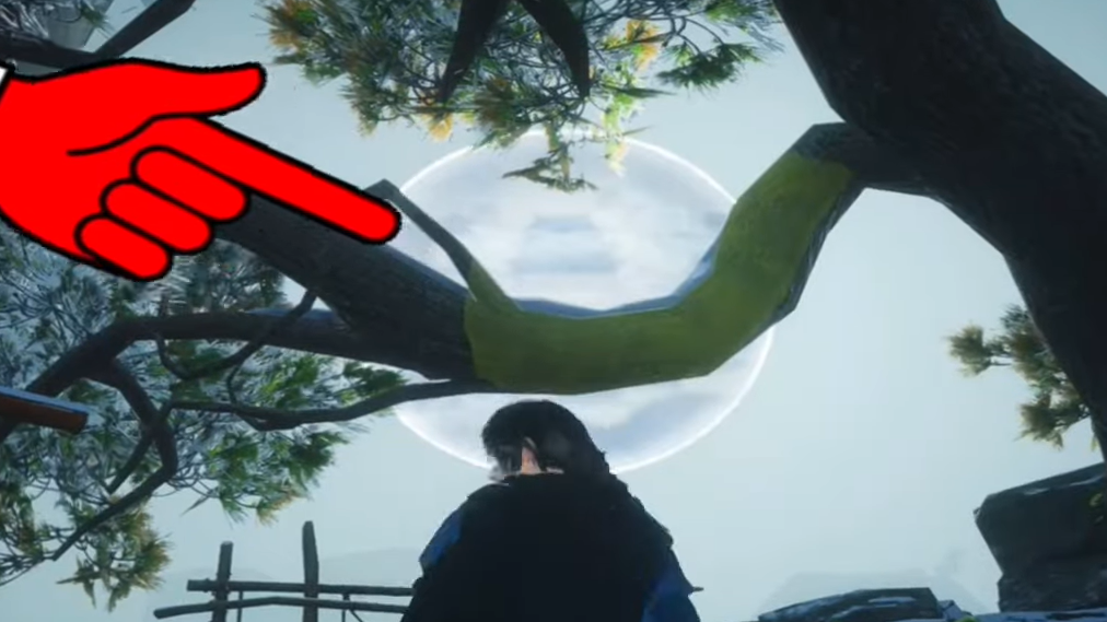 Step 1: Look up at the sky near the quest marker and locate the moon. If it's not visible, check whether the in-game time needs to be nighttime. The puzzle area should have a prominent tree with an extended branch.