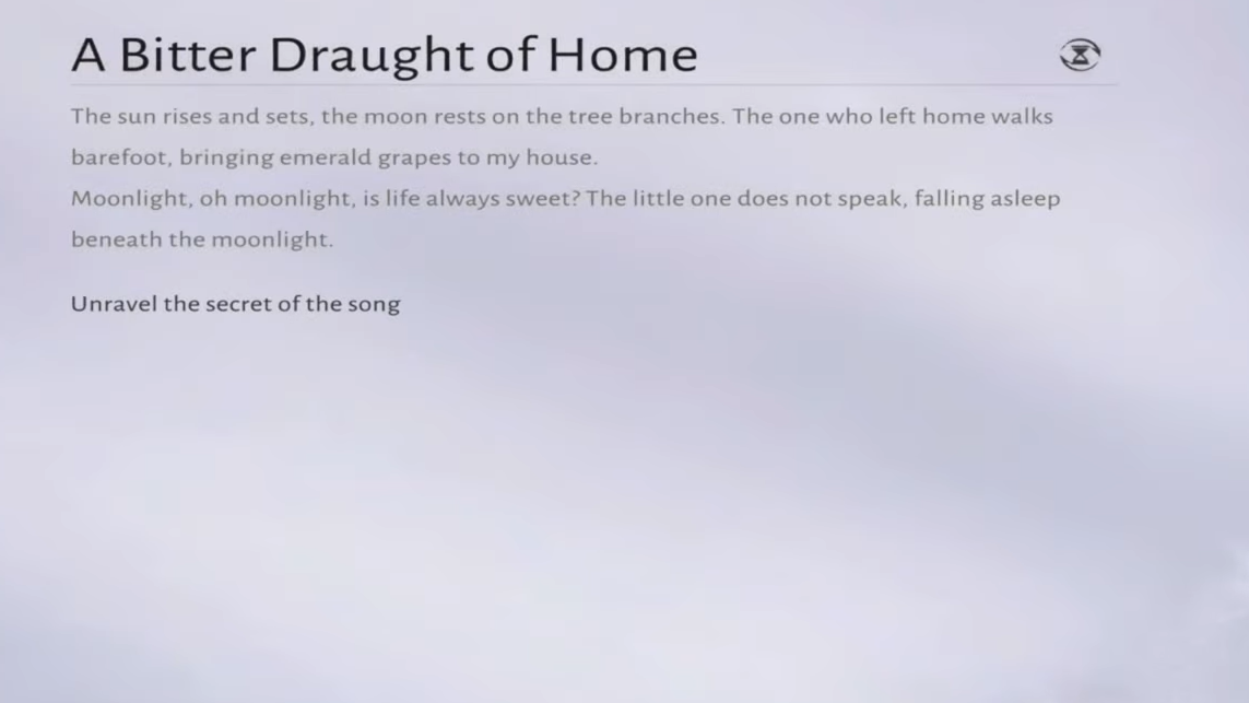 After progressing through A Bitter Draught of Home, you'll reach a point where the objective simply reads "Unravel the Secret of the Song." A quest marker appears on the map, but arriving at the location doesn't immediately advance anything. There's no NPC to talk to and no obvious interactable object. The puzzle is entirely environmental.