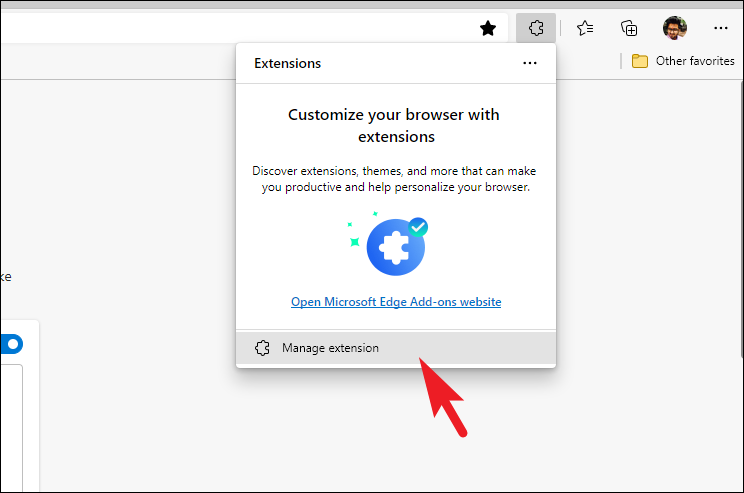 Step 2: In the prompt that appears, click on Manage extensions to view all installed extensions.