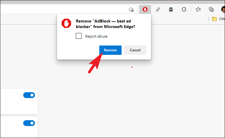 Step 4: A confirmation dialog will appear. Click Remove to uninstall the extension from Edge.