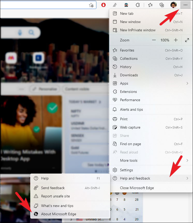 Step 1: Open Edge and click the three-dot menu icon (⋮). Hover over Help and feedback and select About Microsoft Edge.