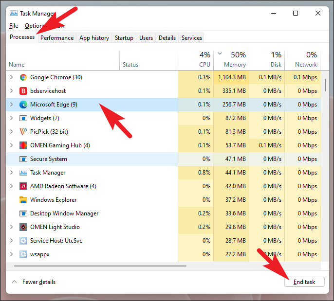 Step 4: Go back to the Processes tab. Select Microsoft Edge from the list and click End Task to close all running Edge processes.