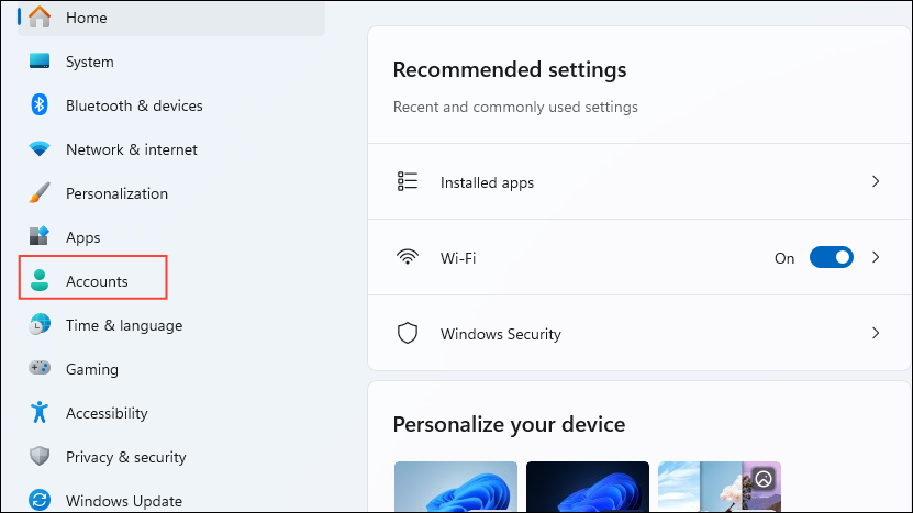 - Open the Settings app and click on the 'Accounts' section on the left.