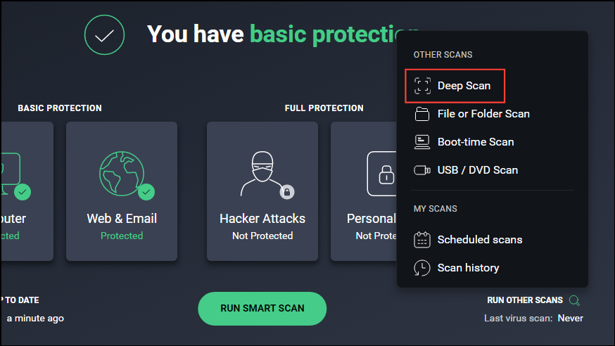 - When the antivirus program opens, click on 'Complete scan' or 'Deep scan' whichever is present, and let it scan your system. If it finds any malware, perform the suggested actions to get rid of it.