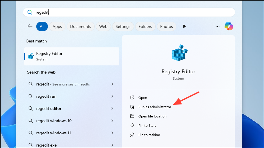 regeditand click on 'Run as administrator'.