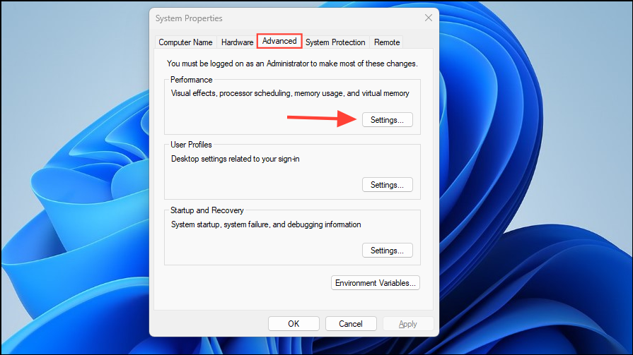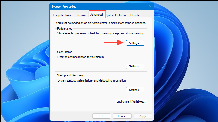- When the System Properties dialog box appears, click on the 'Advanced' tab and then on the 'Settings' button in the Performance section.