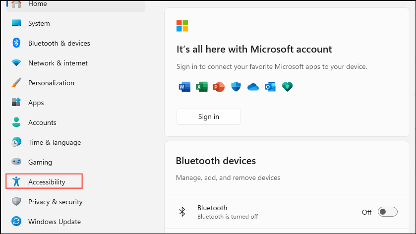 Win + Ishortcut and then click on 'Accessibility' on the left.