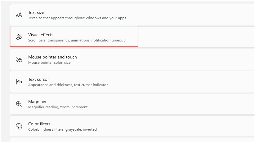 - On the Accessibility page, click on 'Visual Effects'.
