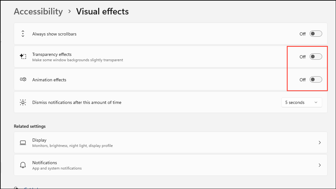 - Now click on the toggles for 'Transparency Effects' and 'Animation Effects' and turn them off.