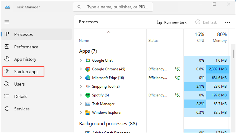- When the Task Manager launches, click on the 'Startup apps' tab on the left.