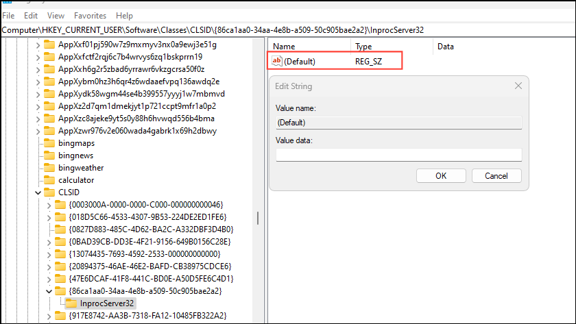 - Double-click on the 'Default' string on the right but do not input any value and just leave the Value data field blank. Then close the Registry Editor and restart your PC.