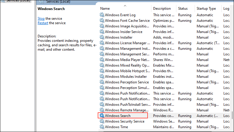 - When the Services utility opens, scroll down to 'Windows Search' or 'Indexing Service' and double-click on it.