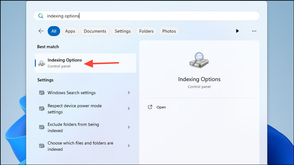 Indexing Optionsand click on it when it appears in the search results.