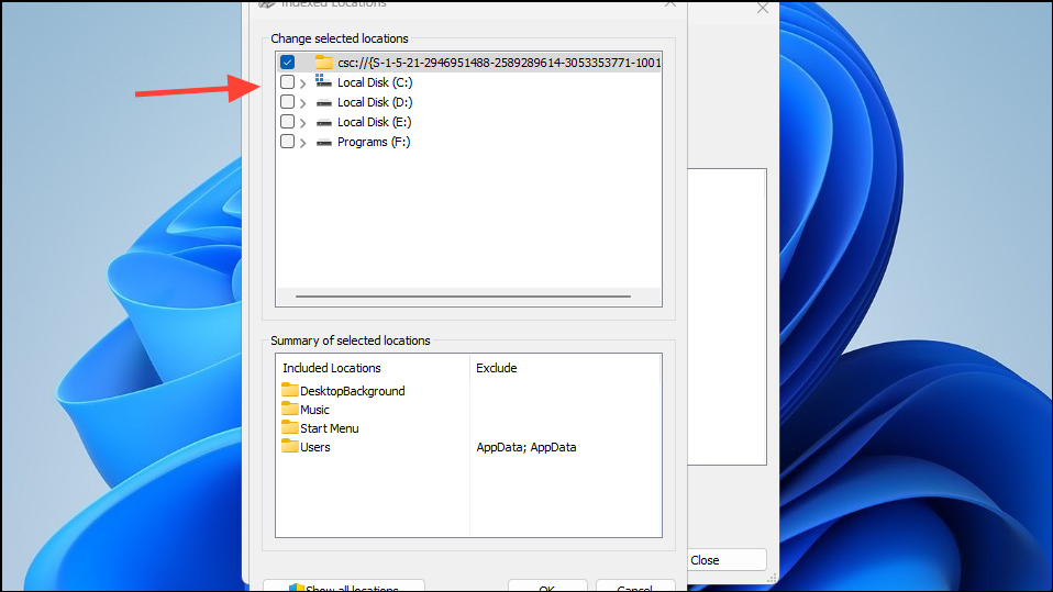 - Now you will see the various locations that are being indexed. You can click on the checkboxes to disable the locations you do not want Windows to index.
