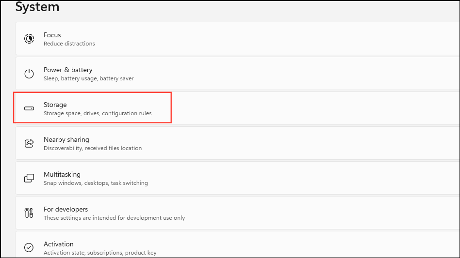 - On the System page, click on 'Storage'.