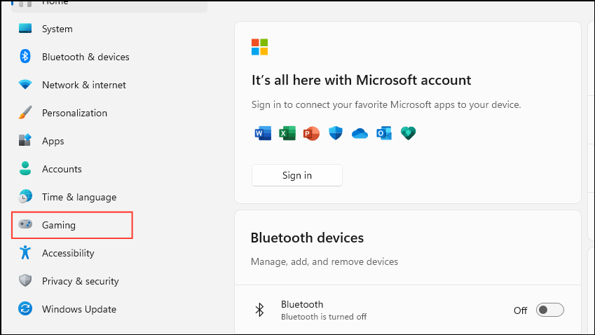 - Open the Settings app and click on 'Gaming' on the left.