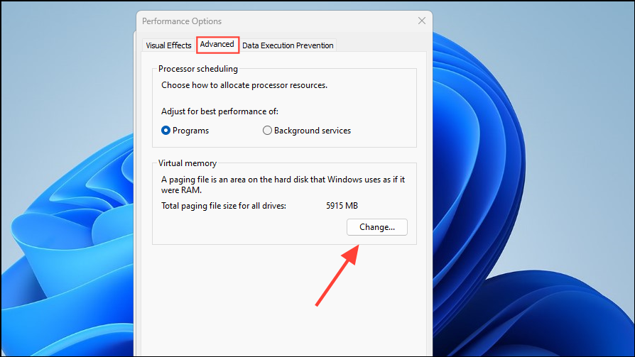 - Now, click on the 'Advanced' tab at the top and then on the 'Change' button in the Virtual Memory section.