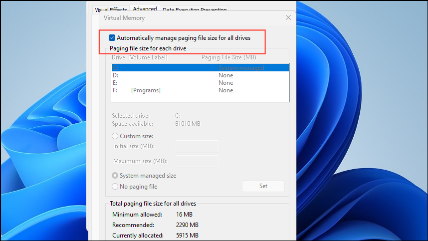 15. Allow Windows to automatically manage page file size
