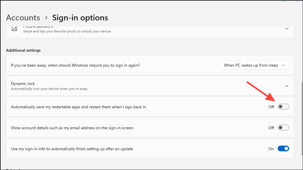 - Now, click on the 'Automatically save my restartable apps and restart them when I sign back in' and turn it off.