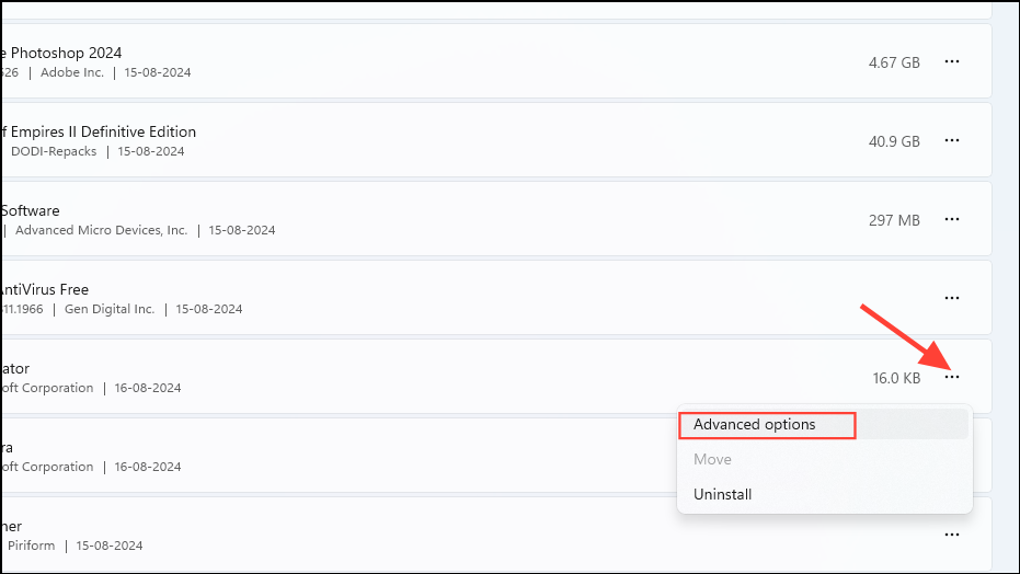 - A page will open showing all your installed apps in one location. To prevent a system application from running in the background, click on the three dots on its right and then on 'Advanced Options'.