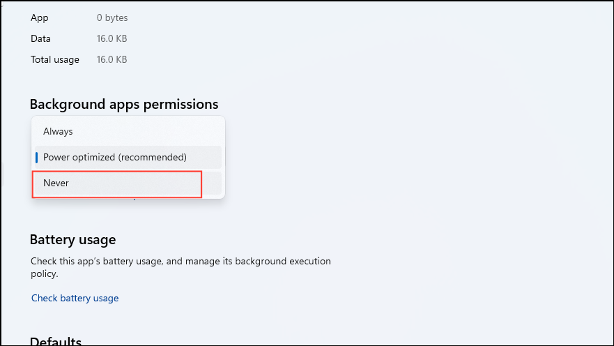- On the next page, click on the dropdown menu for the 'Background apps permissions' and select 'Never'.