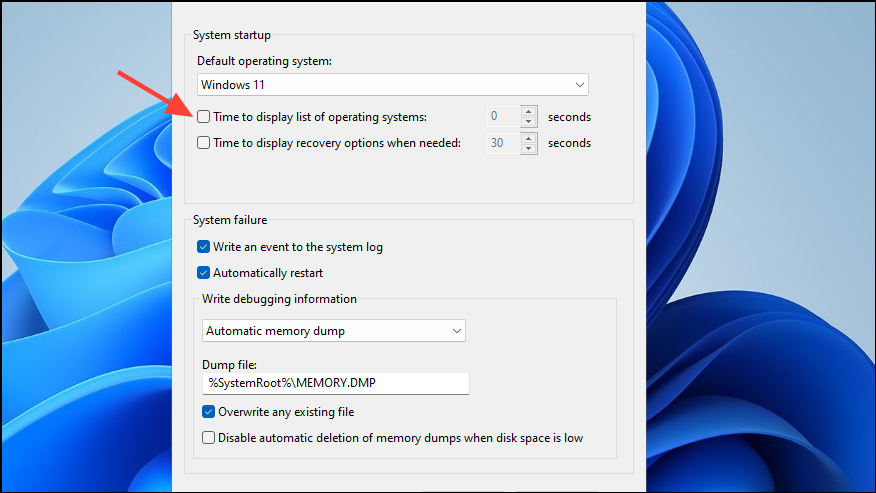 - Click on the checkbox next to the 'Time to display list of operating systems' option to disable it. Then click on OK.