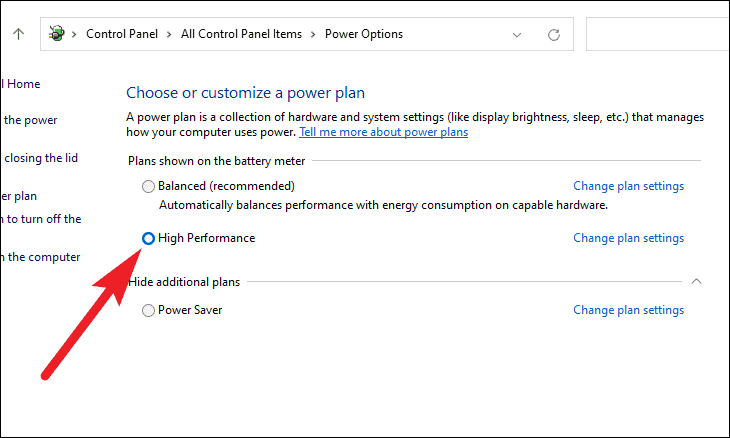 - You'll see the available power plans. Select "High Performance" by clicking the radio button next to it.