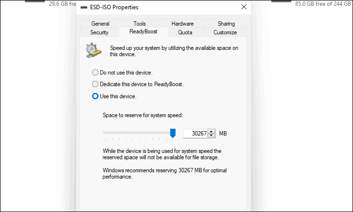 - Select "Properties" and go to the ReadyBoost tab.