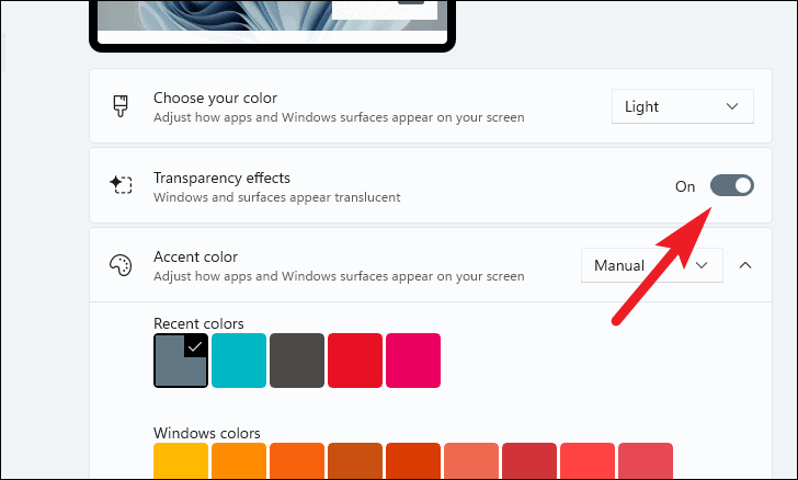 - Toggle off "Transparency effects".