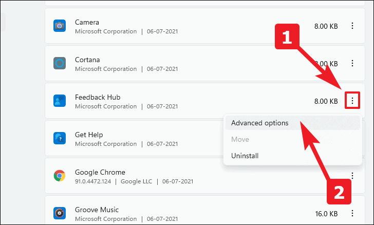 - Click the three-dot menu next to an app and select "Advanced options".