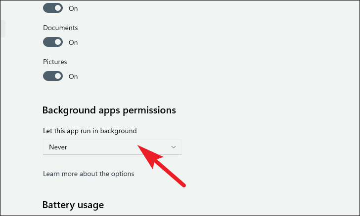 - Under "Background apps permissions", click the dropdown and select "Never".