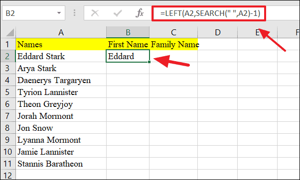 Step 1: To extract the first name from cell A2, enter the following formula in cell B2: