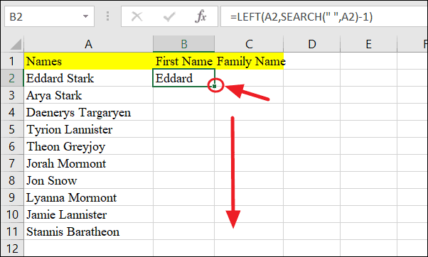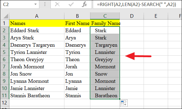 Step 4: Again, use the fill handle to apply the formula to the rest of the cells in the column. The last names will be extracted accordingly.