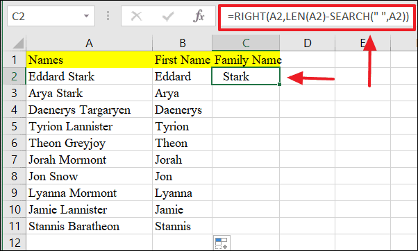Step 3: To extract the last name from cell A2, enter the following formula in cell C2: