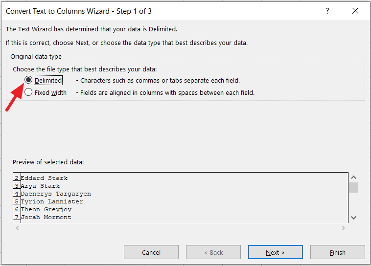 Step 3: In the Convert Text to Columns Wizard, choose Delimited as the original data type since the names are separated by spaces. Click Next.