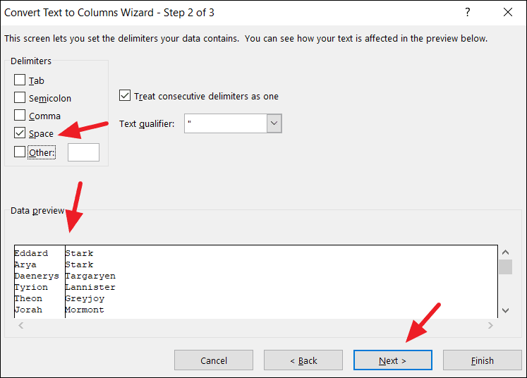 Step 4: In the next step, select the delimiter that your data uses. Check the Space option and ensure other delimiters are unchecked. You can view how your data will be split in the Data preview section. Click Next.