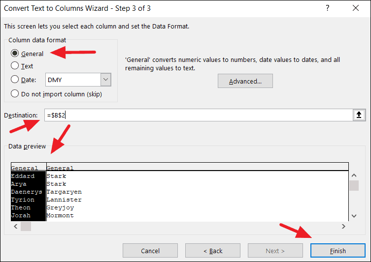 Step 5: Choose the data format for the new columns; select General. In the Destination field, specify where you want the split data to appear. By default, it will overwrite the original data, so it's advisable to select a new location (e.g., starting at cell B2). Click Finish to apply the changes.